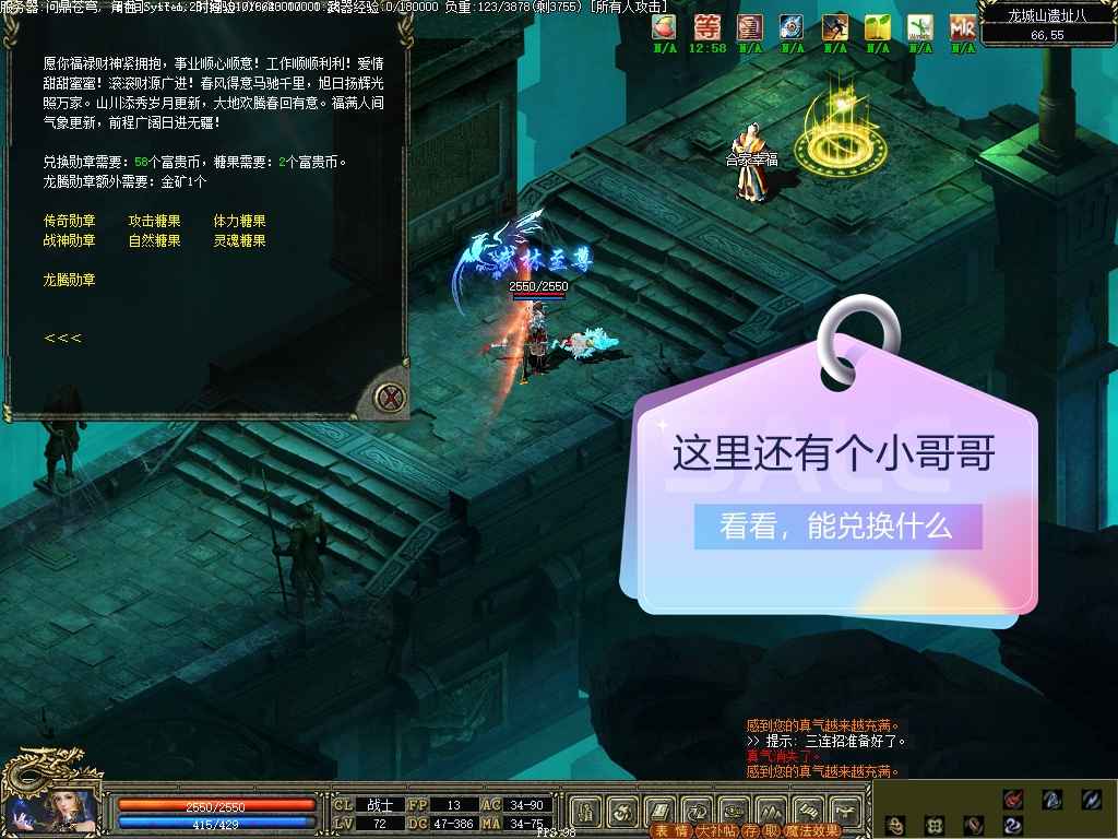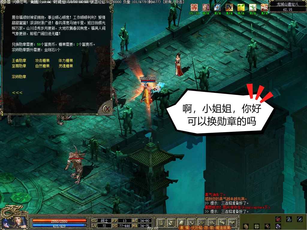 永恒经典Mir3特色项目之一:龙城山换勋章活动,炫酷外光勋章,长期开放兑换,龙城山遗址在苍月岛,可由潘夜岛北部码头坐船过去,入口苍月岛村子西边,离村子非常近,在遗址内猎杀吞金兽可获得富贵币,在最低层兑换勋章等物品。勋章加角色幸运,是运9的重要组成部分之一,额外还有其他属性,更有炫酷的外发光特效,可能是永恒经典Mir3的最好的特色之一,勋章有很多种,佩戴后男女角色可能会有不一样的超酷外光特效。